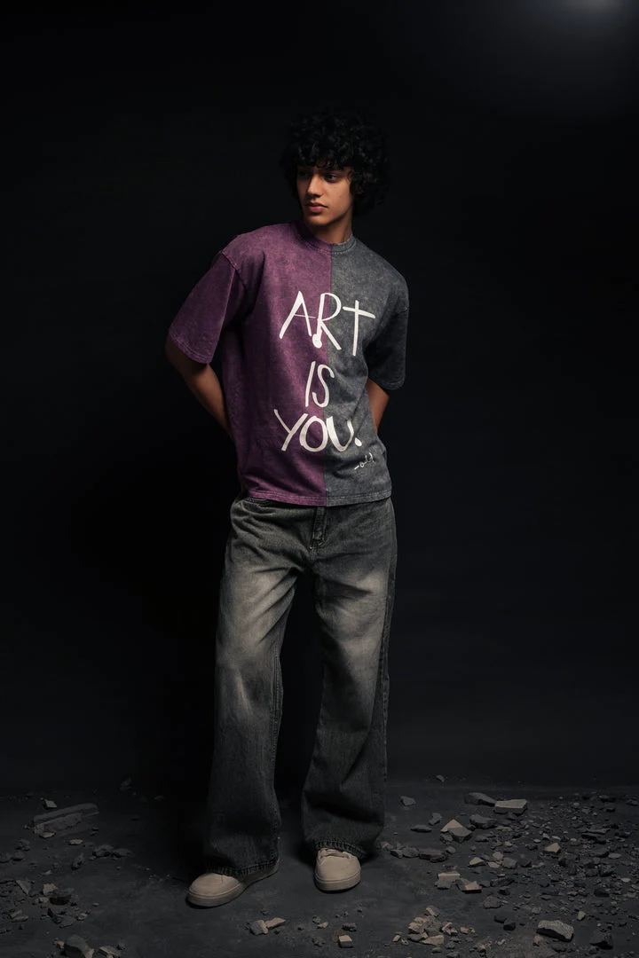 Oversized Tshirt featuring two distinct different coloured halves and a screen-printed front