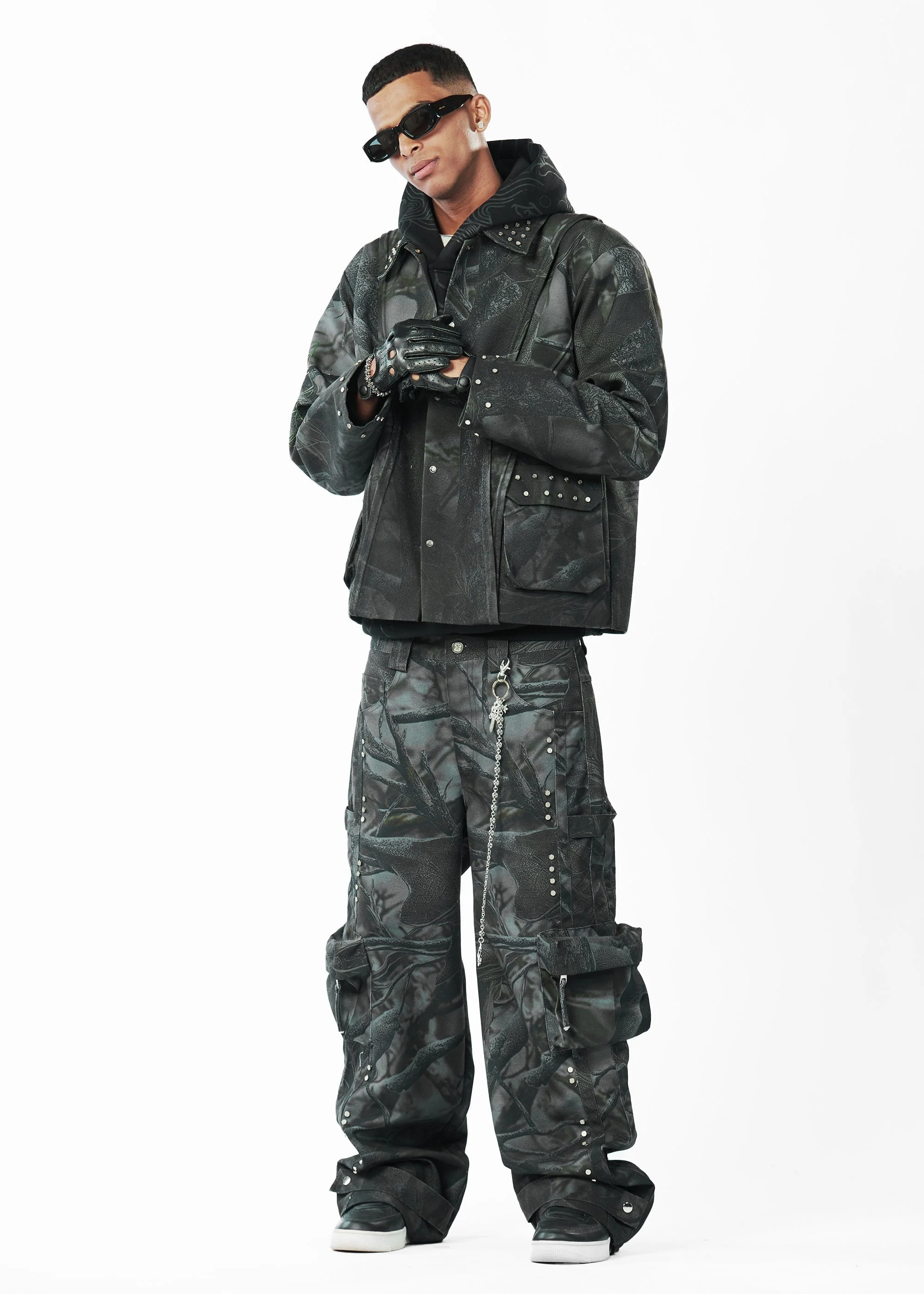 The Real Tree cargo features an all-over dark-toned Real Tree print, enhanced with black ombré pigment spray detailing along the leg openings. It is finished with rivet detailing on the side hems and functional cargo pockets, complete with a self-fabric string attached to a metal puller. The front has an Evemen branded metal button, while snap button closures at the leg openings allow the hem to be tightened or left loose for adjustable styling. Each piece is individually pigment-sprayed, taking over 140 minutes to complete ensuring no two garments are exactly alike.