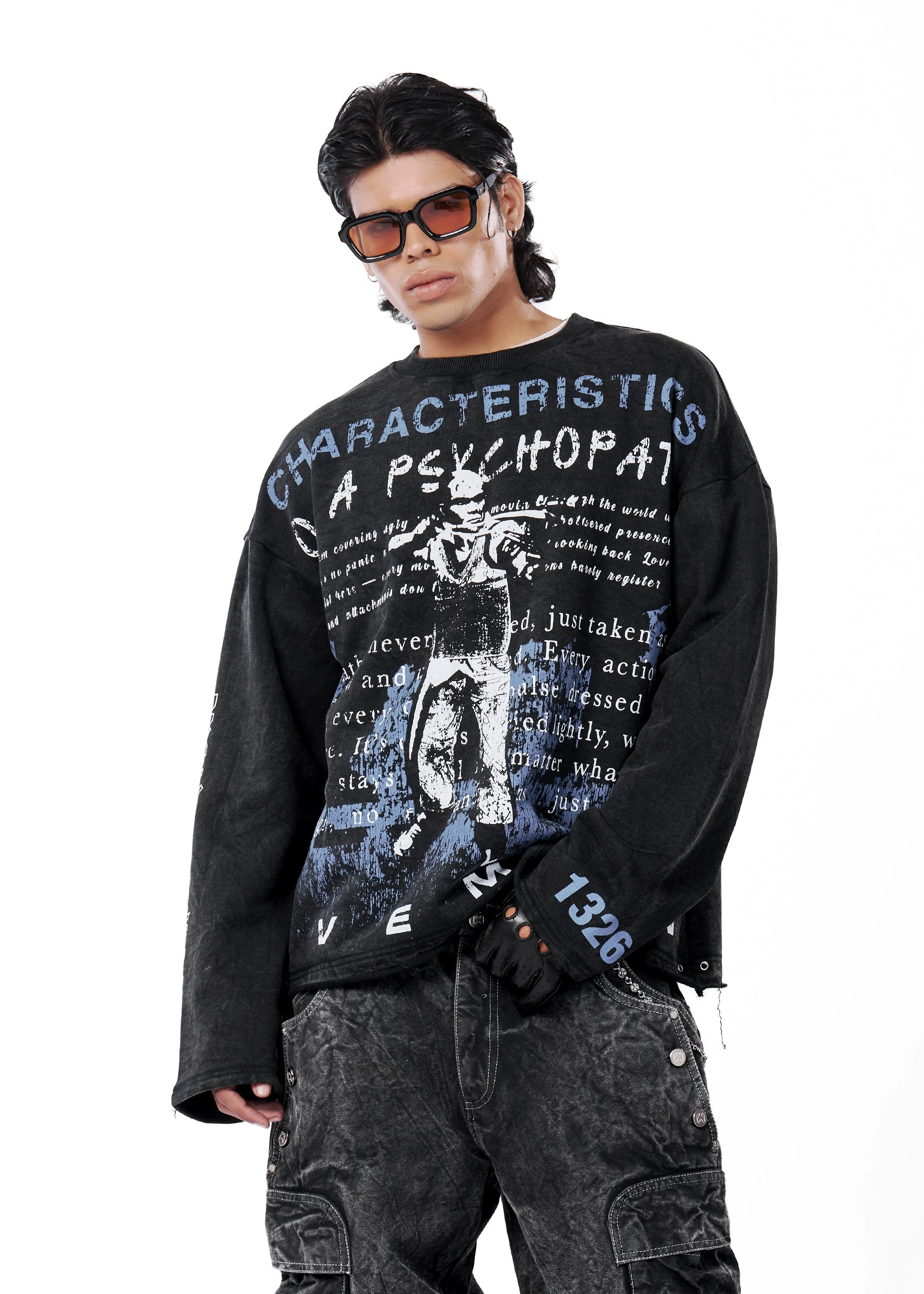 This round-neck, long-sleeve Psy Tee is crafted from 230 GSM single jersey, featuring drop shoulders and a boxy fit. Finished with a dark charcoal stone wash, it showcases flat screen prints inspired by the game Bully across the front and sleeves, complemented by Evemen branding on the front. Each piece is individually washed, taking over 190 minutes to complete ensuring no two garments are exactly alike.